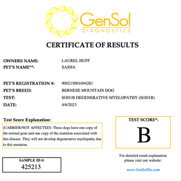All our dogs are AKC registered and DNA tested. They have completed OFA hip, elbow, and heart testing. They have also been genetically tested for degenerative myelopathy, SOD1B degenerative myelopathy, and Von Willebrand's Disease Type 1 (see below).